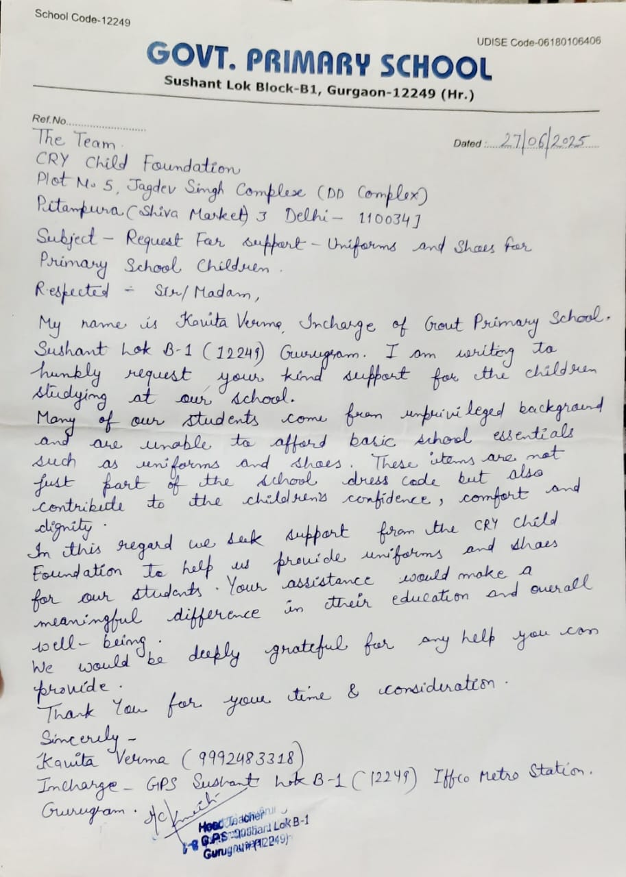 General Donation For Distributes Uniforms and Shoes to Primary School in Sushant Lok Phase-1, Gurugram